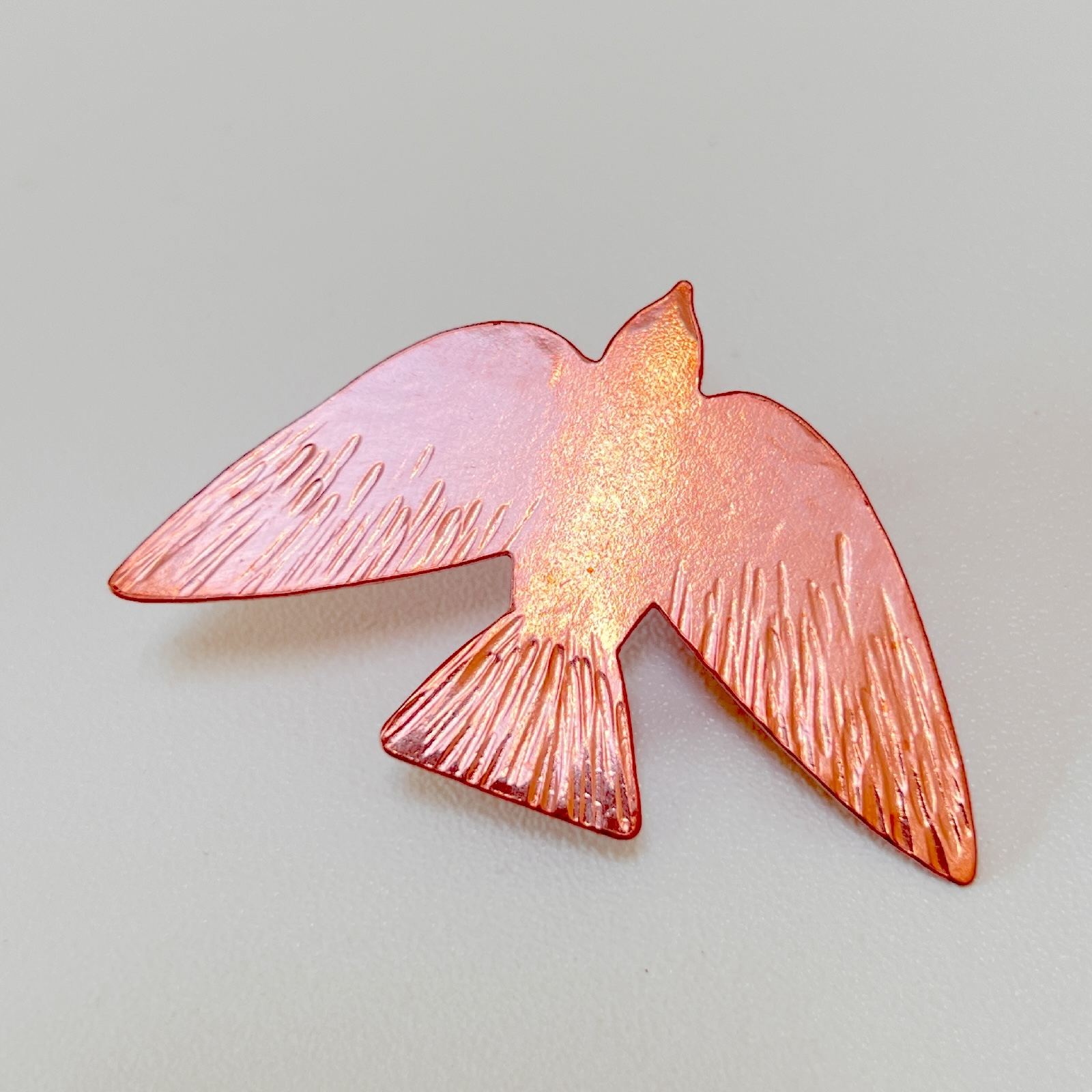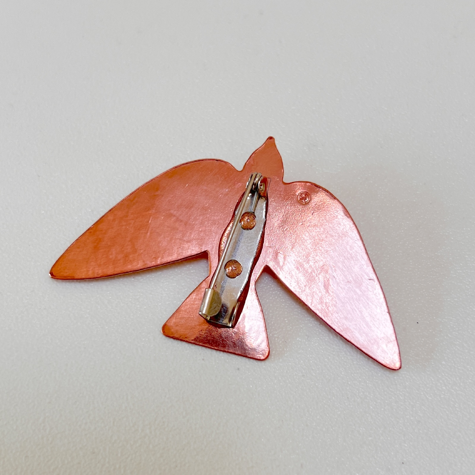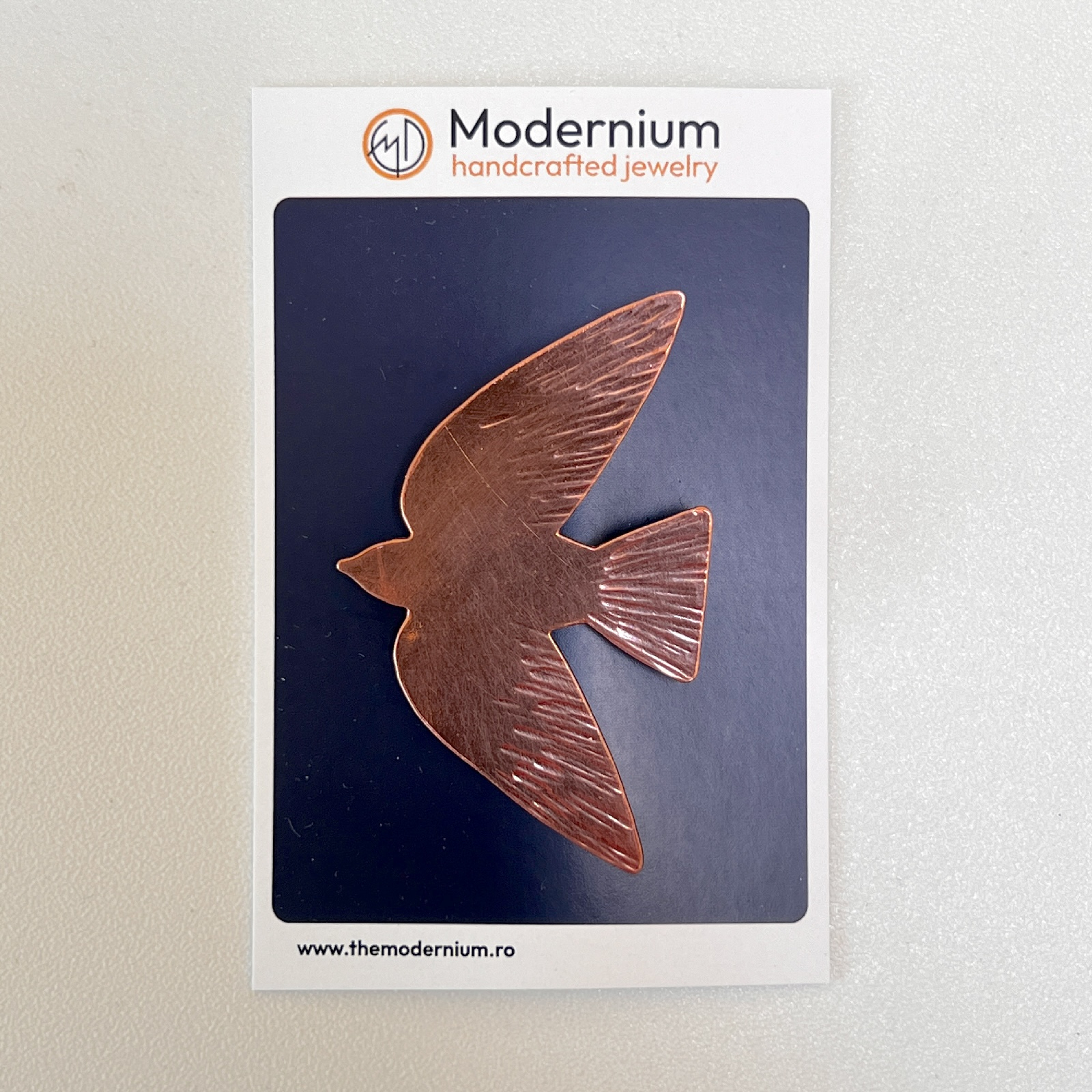 Broșă realizată manual din cupru prin metode tradiționale de prelucrare a metalului.